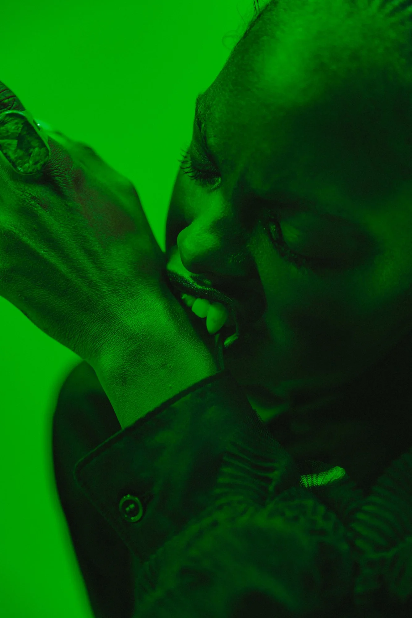 Every color in this editorial tells a story of our vampiress's power: green to lure her victims, red for the feast, and blue for the aftermath when she's ready to take on the world. We secured an incredible studio through Peerspace, with five Aputure Nova 300c RGB lights and a spacious 20'W x 20'L x 14'H cyclorama wall to achieve these bold chromatic statements. Despite our intimate team of six, the generous space allowed the freedom to create without constraints.