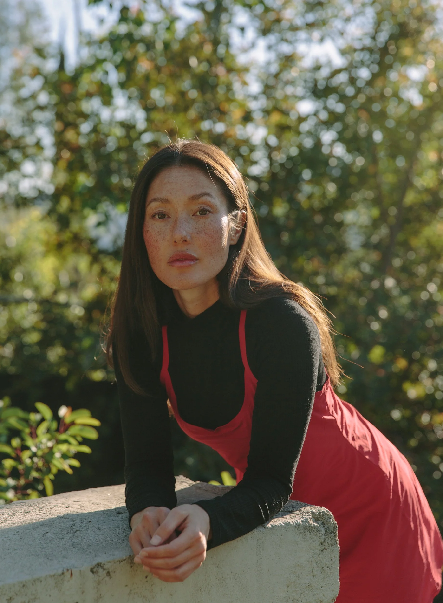 A woman with straight brown hair and freckles leaning on a concrete wall outdoors surrounded by green trees, wearing a black long-sleeve shirt and a red dress, with sunlight filtering through the leaves.